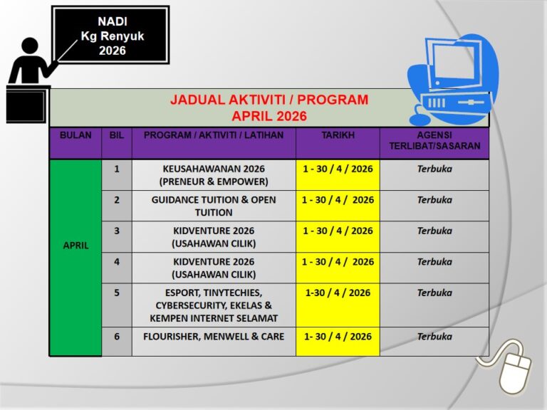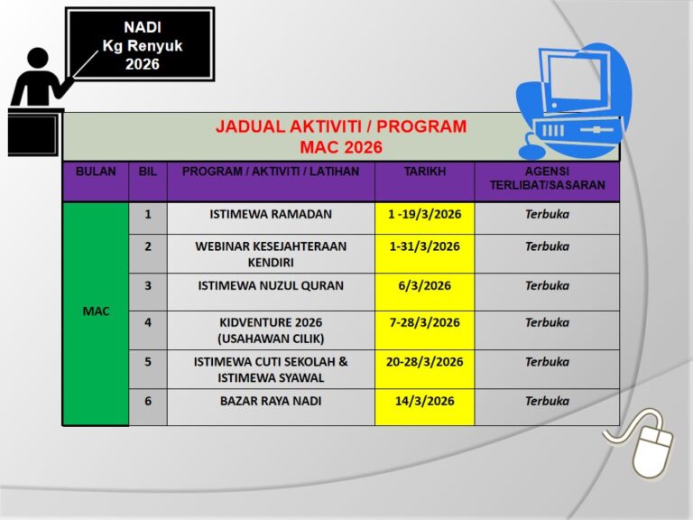 Tarikh : 14 Mac 2026 Masa : 9.00 Pagi – 3.00 Petang Lokasi : NADI Kg Renyut Jumlah Peserta : 18 Orang TUJUAN : AKTIVITI : Gambar Di Sini