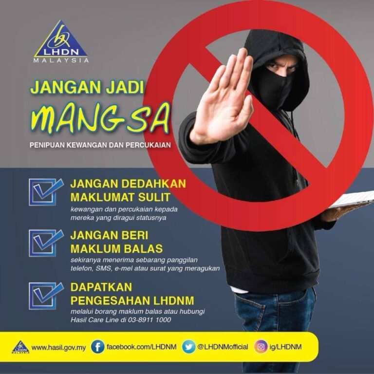 Berhati-hati dengan penipuan (scam) atas talian dan SMS. Jangan dedahkan maklumat kewangan peribadi kepada pihak yang diragui. Sumber Info Grafik : Lembaga Hasil Dalam Negeri (LHDN)