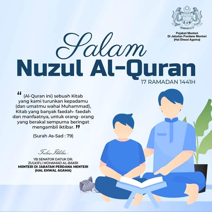 Salam Nuzul Al-Quran (10 Mei 2020) 17 Ramadan 1441H. Teruskan membaca, menghayati dan memahami isi kandungan al-Quran. Rebutlah ganjaran pahala yang berlipat ganda dalam bulan mulia ini. Sumber Info Grafik : Jabatan Perdana Menteri (Hal Ehwal Agama)