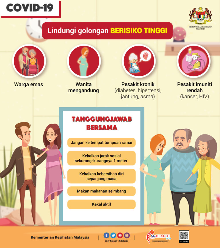 Terdapat beberapa golongan berisiko tinggi dan mudah untuk dijangkiti terutamanya bagi mereka yang mempunyai masalah kesihatan serta sejarah penyakit kronik. Ayuh kita semua lindungi golongan-golongan tersebut. Sumber Info Grafik : Kementerian Kesihatan Malaysia (KKM) & Majlis Keselamatan Negara (MKN)