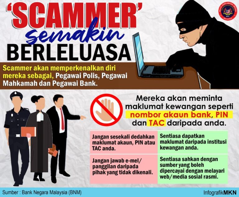 Dalam keadaan situasi sekarang, semua diminta supaya sentiasa berhati-hati dan waspada dengan penipuan yang semakin berleluasa. Jangan mudah percaya dan memberi sebarang maklumat peribadi kepada orang lain. Sumber Info Grafik : Majlis Keselamatan Negara (MKN) & Bank Negara Malaysia (BNM)