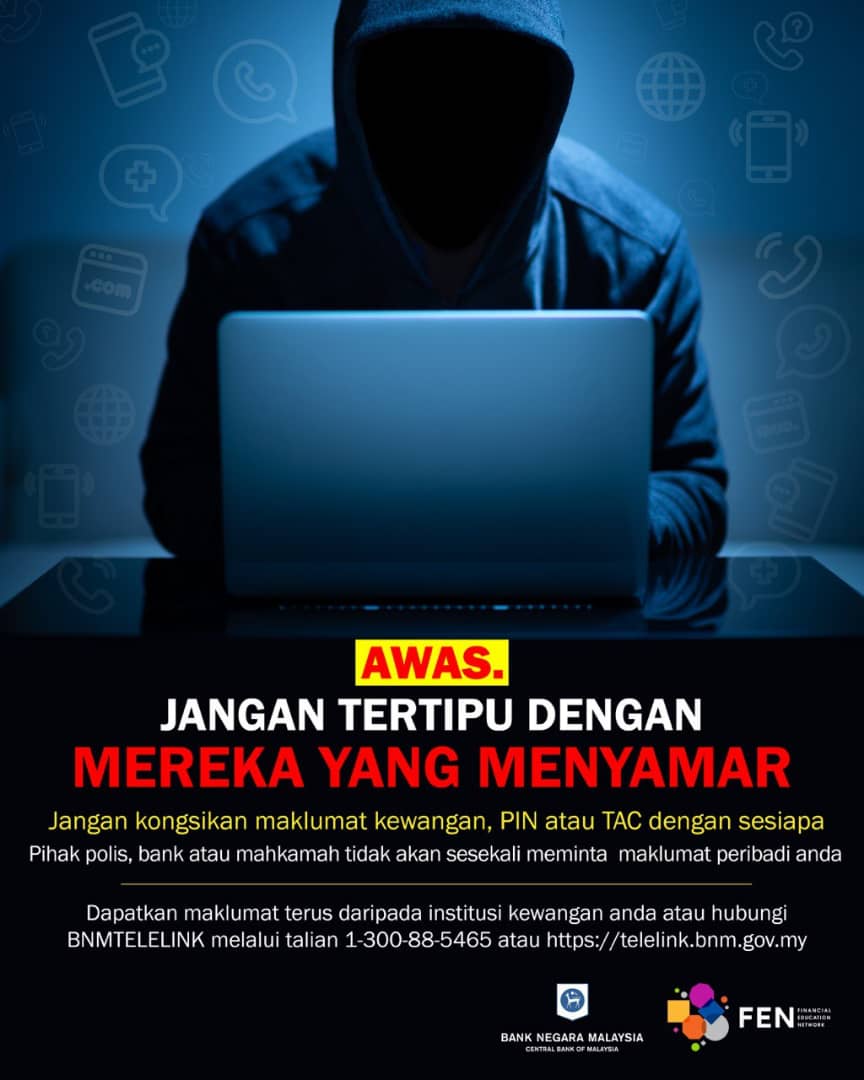 Dalam keadaan situasi sekarang, semua diminta supaya sentiasa berhati-hati dan waspada dengan penipuan yang semakin berleluasa. Jangan mudah percaya dan memberi sebarang maklumat peribadi kepada orang lain.