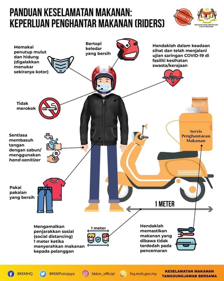Sepanjang tempoh PKP dan terutamanya dalam bulan Ramadan mungkin ramai yang akan membuat pesanan makanan melalui atas talian. Anda disarankan memesan makanan yang berkhasiat seperti mana yang disarankan oleh Kementerian Kesihatan. Bagi penghantar makanan atau lebih dikenali sebagai (Riders), anda perlu mengikut panduan keselamatan makanan iaitu perkara atau keperluan yang perlu diambil berat selaku penghantar makanan.