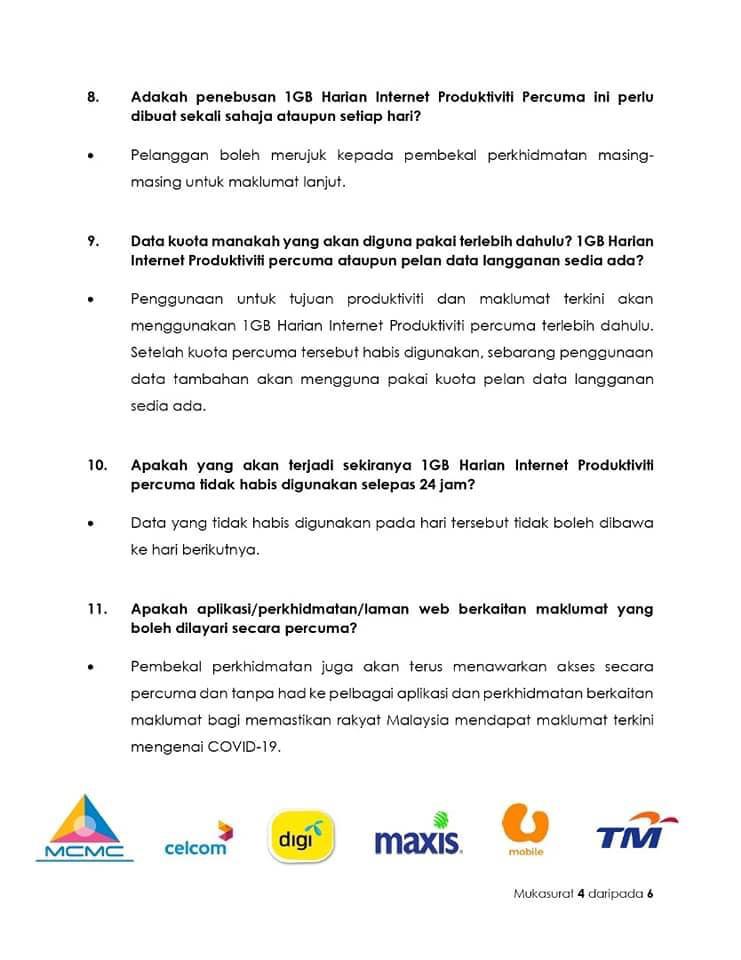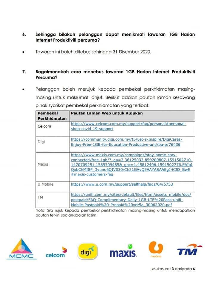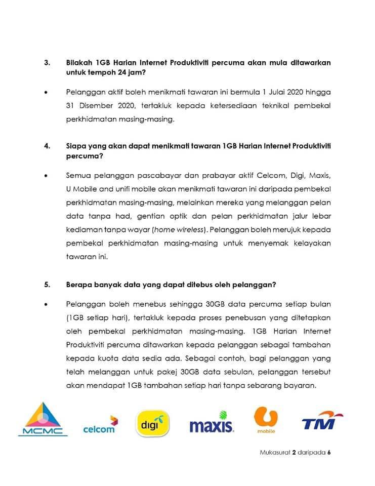 Selaras dengan rancangan pemulihan jangka pendek kerajaan, MCMC bersama pembekal perkhidmatan mudah alih utama terus menyokong keperluan bekerja dan belajar dari rumah dengan melanjutkan kemudahan 1GB Harian Internet Produktiviti secara percuma untuk tempoh 24 jam bermula 1 Julai 2020 hingga 31 Disember 2020.