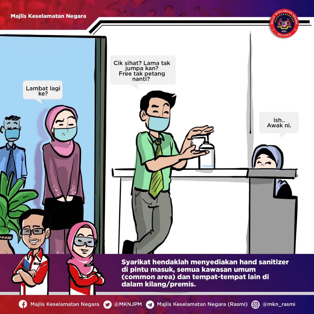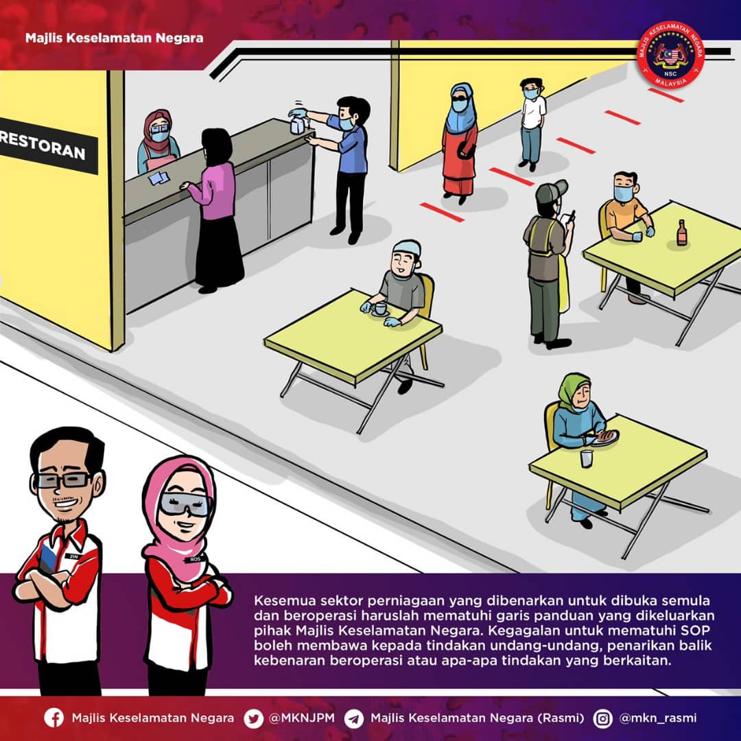 Amalan dan norma kehidupan baharu serta peraturan yang wajar diikuti dalam menangani dan mencegah penularan wabak Covid-19. Semua pihak harus berganding bahu dan bertanggung jawab. Tingkatkan kawalan kendiri. Pastikan keselamatan diri, keluarga dan komuniti berada di tahap maksimum. Kita mesti menang!