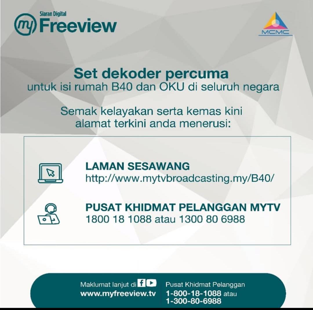 Isi rumah B40 dan golongan orang kurang upaya (OKU) yang masih belum menerima set dekoder myFreeview percuma adalah digesa untuk membuat semakan dan mendaftar segera sebelum 31 Mei 2020 di portal https://status.mytvbroadcasting.my/ atau hubungi Pusat khidmat Pelanggan MYTV di talian 1800-18-1088/1-300-80-6988.